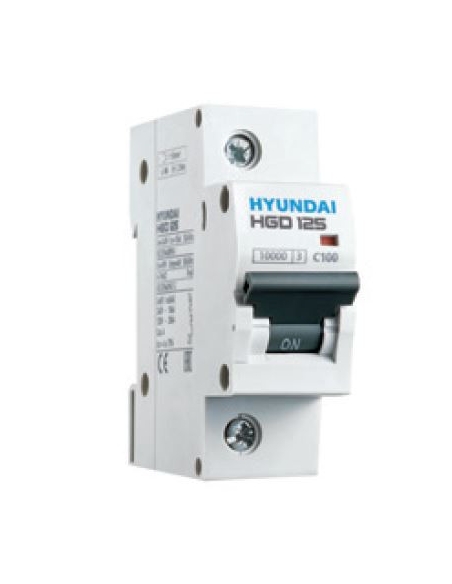 Magnetotérmico 1 polo 100A curva C, para protección contra cortocircuitos y sobrecargas en instalaciones monofásicas o bifásicas. Marca Hyundai. Con un poder de corte asignado segun IEC/EN60898 de 10000A (10kA) y 15000A (15kA) según IEC/EN60947, protección activa de los polos con indicación de estado...