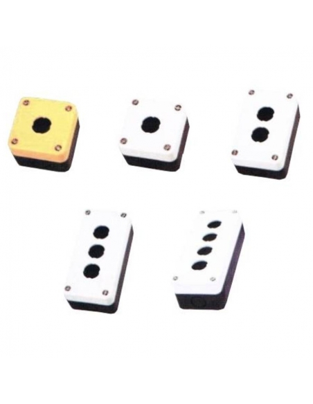 Reihe von Kästen mit Mechanismen bereits installiert, von 1 Element bis 5 Elemente aus Kunststoff, grau und gelb.
